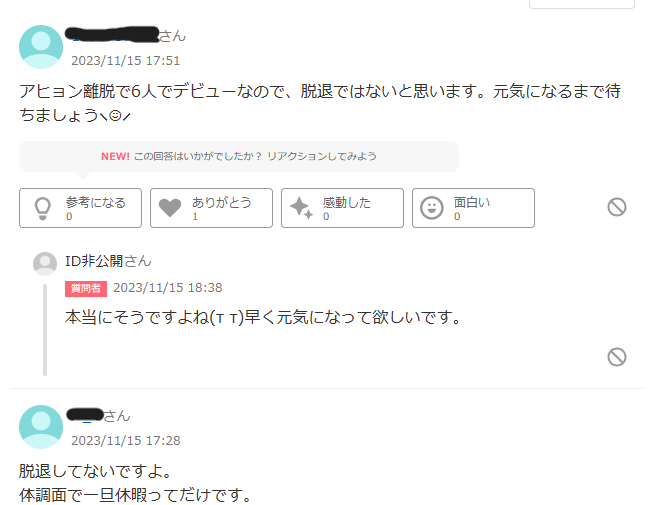 この記事に対し一部のファンは、アヒョンさんはベビモンを「脱退」するのではなく「一時的な離脱」であるとし、体調が回復したらベビモンに戻ってくると信じて待っています。