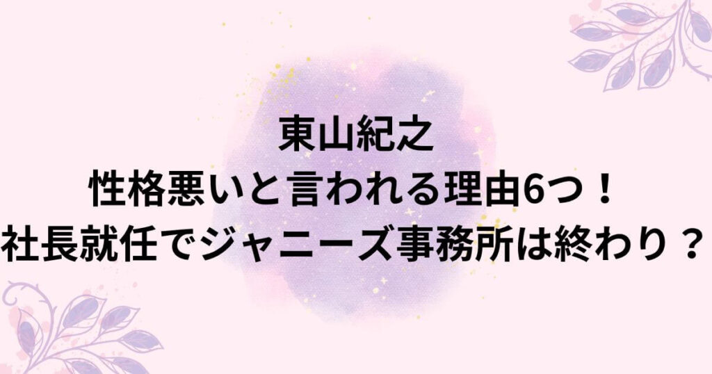 ジャニーズ事務所の新社長に就任した東山紀之さんですが、ネットでは東山紀之さんの性格の悪さが噂されています。 一体なぜなのでしょうか。 また、そんな東山紀之さんが新社長となるジャニーズ事務所は今後本当に大丈夫なのでしょうか。 そこで今回は「東... -